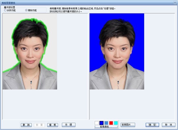 背景处理无疑是一个让人头痛的问题,通常人们会用PS中的钢笔或者橡皮擦来解决,这样不但耗时耗力,而且人像的边缘会扣得比较生硬,常常会丢失一些头发的细节,效果不是那么逼真。而证照之星中的'智能背景替换'功能可以让我们只要短短几秒钟的时间,就可以实现完美的背景替换!系统已经自动将前景和背景之间的粘合区域给标识出来,我们只要通过魔术擦工具进行简单的修饰就可以了。之后点击'处理'按钮。前景可以被很完整地扣除出来,我们只需要换上我们需要的各种背景色或者背景图片。
