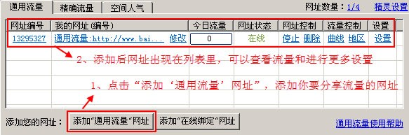 4、添加网址:用于添加“通用流量”网址、“在线绑定”网址、“精确流量”网址、“空间人气”网址以及相关使用帮助按钮;