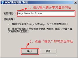 软件运行后,点击“添加‘通用流量’网址”按钮,然后输入要分享流量的网址,点击“确定”,如图: