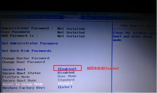 1、首先,开机一直按F2或(FN+F2)进入BIOS,在按→方向键切换到Security,在选择Secure Boot回车设置成Disabled;