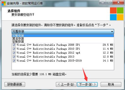 4、可以选择“完整安装”“简洁安装”“定制安装”,选择需要安装的组件,选择完成继续点击“下一步”;