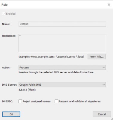 添加一个后 DNS服务器,您需要将其分配给 规则. 为此,打开 配置->规则通过菜单或工具栏图标。您可以通过双击或单击来使用持久性默认规则 编辑...,或者您可以通过单击创建一个新的 添加...该默认如果没有其他规则匹配的决心请求规则将被执行。