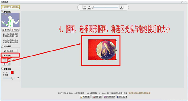 4、抠图:点击抠图,选择形状抠图-圆形抠图。调整抠图大小,使选区与泡泡大小接近。