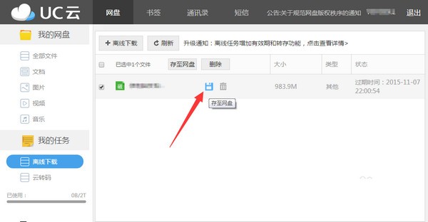7、待对应的离线任务下载完成后,将鼠标移动到对应的离线任务上,从显示的面板中点击“存在网盘”按钮,如下图所示: