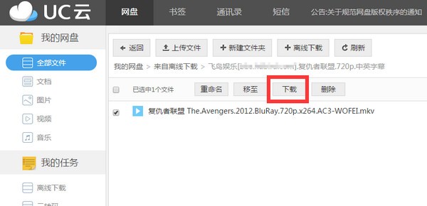 9、目前UC网盘功能比较单一,无法实现在线观看视频文件的功能,不过提供了“下载”功能,如下图所示: