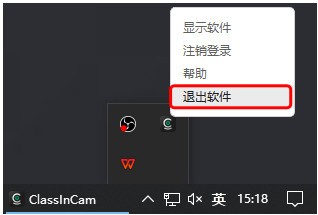 为了防止上课时误点而中断视频流,点击ClassInCam右上方关闭图标只能将软件最小化至系统托盘后台运行。如需彻底退出软件,用户需在托盘右键选择退出软件,如winwin7分享的截图: