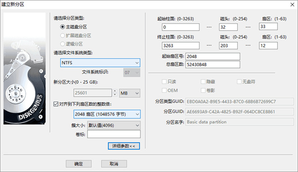 对于GUID分区表格式,还可以设置新分区的更多属性。设置完参数后点击“确定”即可按指定的参数建立分区。