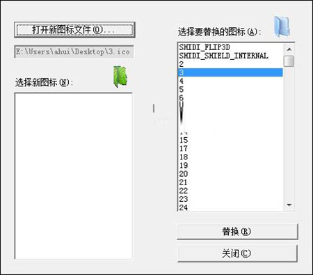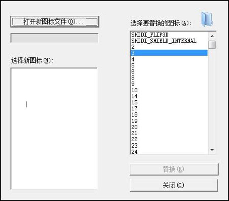 10、弹出了个对话框(替换图标与.........),让你选择你要替换的图标(ico文件),点击左上角的"打开新图标文件(0)..."