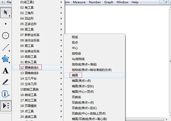 步骤一:选择椭圆工具。打开几何画板,单击左边工具栏的“自定义工具”按钮,在其工具菜单选择“圆锥曲线A”——“椭圆”工具,如下图所示。