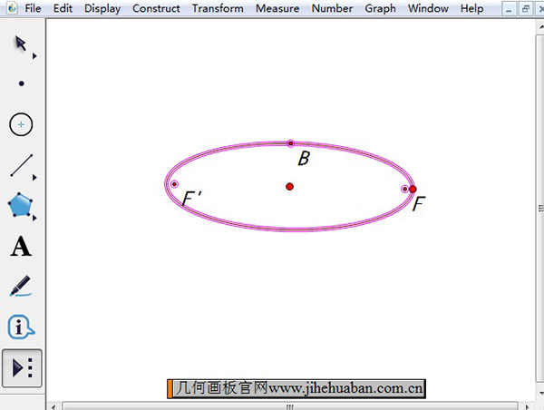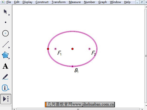 步骤如下:单击左边工具栏的“自定义工具”按钮,在其工具菜单选择“圆锥曲线A”——“椭圆(焦点+点)”工具,在右侧的空白位置单击鼠标两下确定左右焦点的位置,然后拖动鼠标确定椭圆形状即可,绘制的椭圆如下图所示。