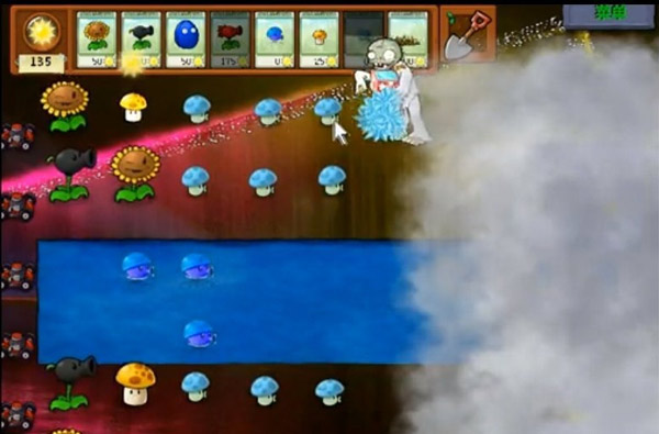 随后玩家要将植物种植在场地中,每种植物都需花费一定阳光点数(小喷菇和海蘑菇除外),一般初始阳光点为50,玩家需通过采集掉落的阳光或者两种阳光植物(向日葵和阳光菇)的产出来获得阳光。