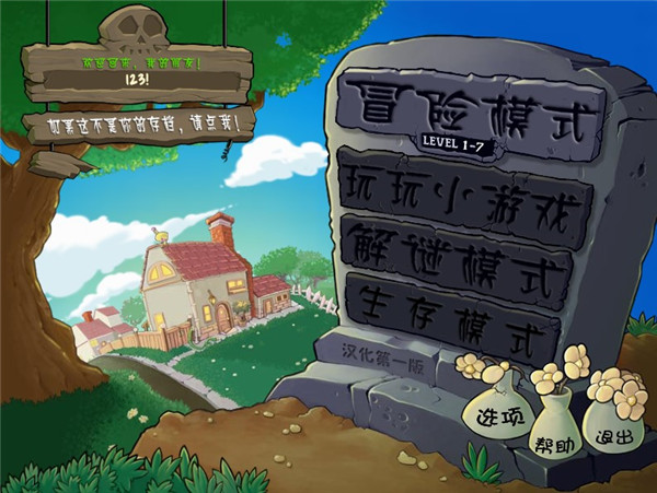 5、点击冒险模式,进入游戏,初次进入会有指引教你如何使用植物来抵挡僵尸