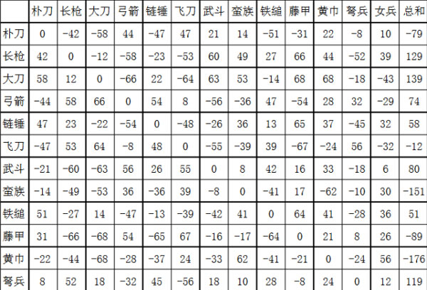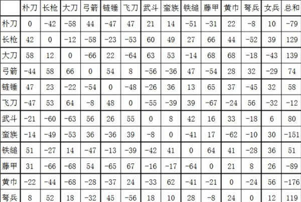 三国群英传2兵种相克表: 以朴刀、武斗、藤甲为代表的短兵器;以长枪、大刀、 铁锤为代表的长兵器;