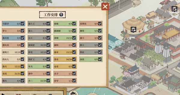 7、平时没什么事情的时候可以提高下赋税到【中等】,一些需要俸禄的建筑的工作人员也可以精简,像是义庄、箭塔这些没事就可以关闭省钱。