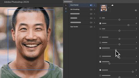 Adobe已经发布了六款参数调节器,主要围绕智能人像修图,它使用GAN生成对抗神经网络算法来变更人脸的细节特征,包括人物的年龄、表情、姿势和光照等,都可以针对性调节。