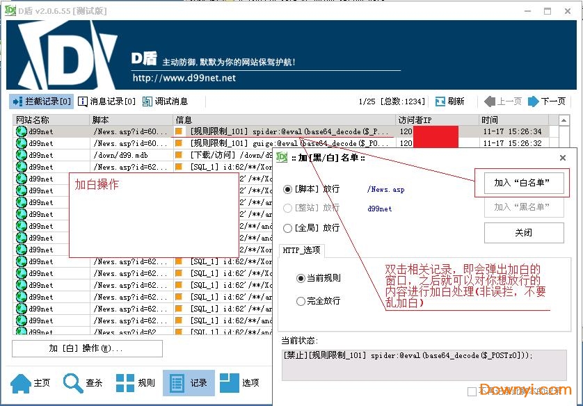 2.误拦的处理当有误拦时,请到d盾的"记录"里查看,双击误拦记录,会弹出加白的窗口,之后点击 [加入“白名单”]即可放行。