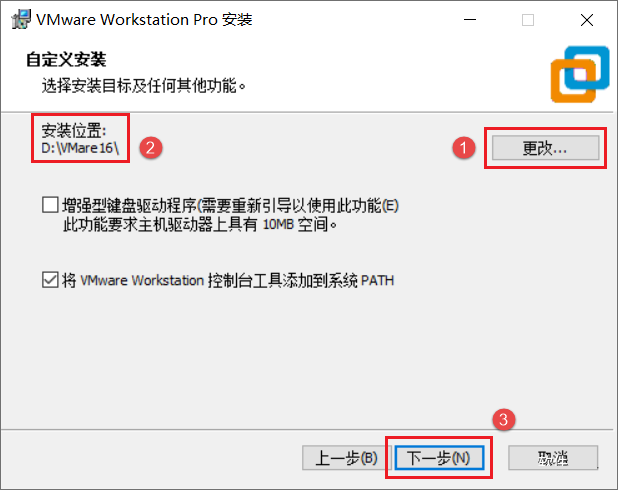 5.选择软件安装路径,默认安装在C盘,点击【更改】可修改安装路径,注意:安装路径文件夹名称均不能含有中文字符!小编这里将软件安装在D盘VMware16文件夹下,然后点击【下一步】,如winwin7分享的截图:
