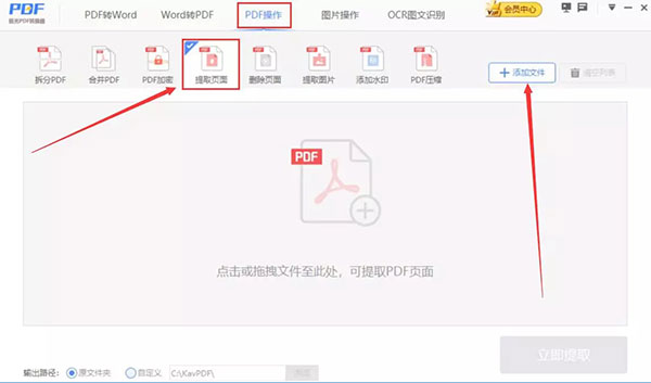 2、然后,我们切换至“PDF操作”的“提取页面”界面,点击右上方的“+添加文件”按钮。