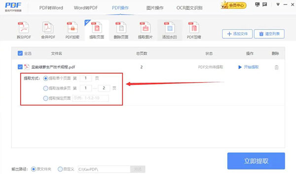 4、接下来,在极光PDF阅读器中,我们根据自己的需要选择提取PDF页面的方式。例如,这里选择的是“提取单个页面”,并设置提取的是第1页。
