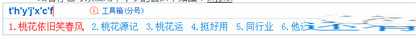 比如,你想输入:桃花依旧笑春风(tao hua yi jiu xiao chun feng),你就可以试着一个个字拼过去,可能到第3个字,这句话就出来了,看小编的,如图: