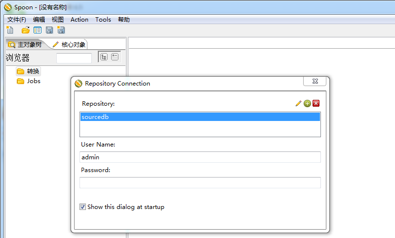 Kettle自己有三个主要组件:Spoon,Kitchen,Pan。其中Spoon是一个图形化的界面,用于windows的时候,先设置环境变量:pentaho_java_home,例如:C:\Program Files\Java\jdk1.7.0_25,其实就是你的java安装目录,1.6以上即可。windows下双击Spoon.bat就可以了,界面如下: