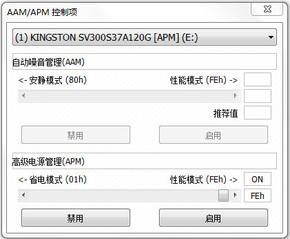 6、同样的在crystaldiskinfo的高级特征中可以进行很多设置,其中的AAM/APM控制最重要。