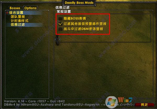 信息过滤 —— 在信息过滤功能中可以选择隐藏BOSS表情,过滤其他插件报警以及战斗中过滤DBM密语警报功能