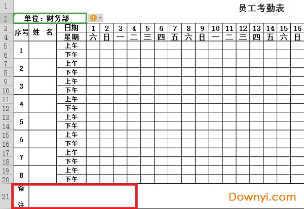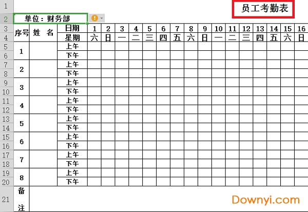 4、最后一栏放一个备注,主要备注每个新员工,或者因为非公请假等事项的一个处理。