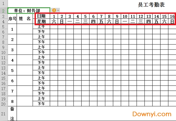 1、必须要拥有的就是考勤表的表头,因为这里的表头可以让我们清晰的看到这个考勤表是几月份的考勤表,到时候有据可依。