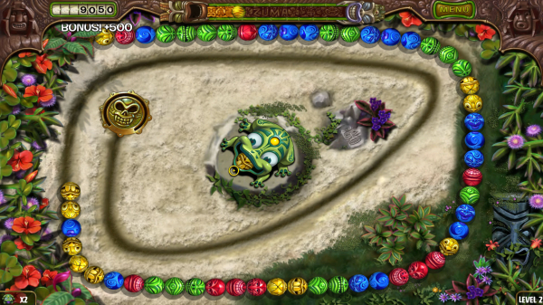 游戏的玩法与前作几乎保持一致,使用鼠标发射彩珠消除,与前作不同的是,这一关取消了射击金币增加生命值的设定,而是改为了射击水果获取一定的增益,这样的改动也比较符合游戏背景,除此外加入的武器系统和boss战让游戏有了那么一点RPG游戏的味道,增加了关卡的趣味性。【发射彩珠】