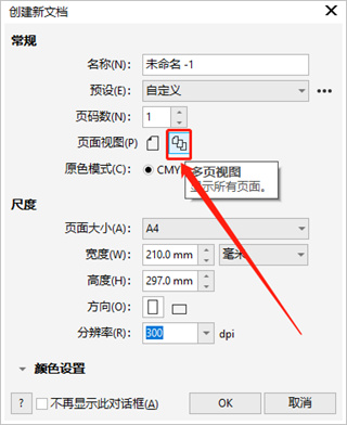 ①运行软件,点击创建新文档。在弹出的窗口中,输入文档名,页面视图选择多页视图,设置好文档的其他参数,点击OK进行创建。