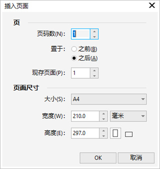 ④点击插入页面,会弹出对话框,在对话框中可以设置页码、页面尺寸以及页面方向,点击OK就可以插入一个页面。