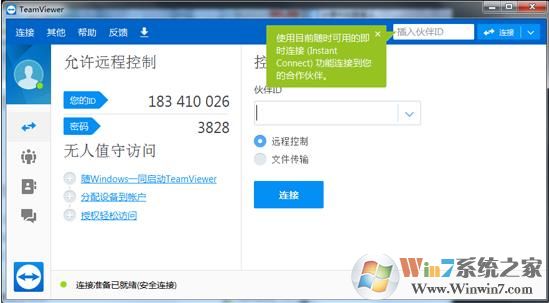 使用TeamViewer连接到另一台计算机,只需要在两台计算机上同时运行 TeamViewer 即可而不需要进行一个安装的过程。该软件第一次启动在两台计算机上自动生成伙伴 ID。只需要输入你的伙伴的 ID 到 TeamViewer,然后就会立即建立起连接。