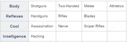 玩家可以在天赋树中任意的构建自己的角色:刀剑,步枪,手枪,暗杀,神经网络,狙击,工程,黑客、弹枪近战,双手能力等等。 属性与天赋也存在关联,例如在冷酷属性中有9点就可以使暗杀,神经和狙击步枪最多升级9个天赋。