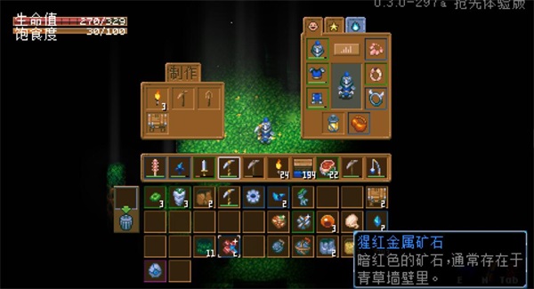 三王打完了回家核心对话,别着急走,解锁最外层墙壁,再往前走,会遇到一种敲不了的墙壁,先沿着墙壁走。直到找到青草墙壁,就有猩红金属矿石了。