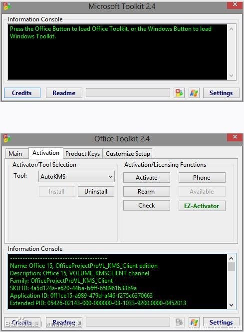 Microsoft Toolkit 2.4.5绿色版是一款免费的Windows8激活工具和Office2010/2013激活工具,由国外大神CODYQX4制作。运行Microsoft Toolkit,点击界面右下角的Office图标进入Office Toolkit界面,上面选择Activator,点击EZ-Activator进行激活 Office2013;点击Windows图标进入Windows Toolkit界面,上面选择Activator,点击EZ-Activator进行激活Windows8系统。