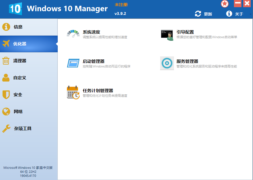 Manager是一款专业用于微软Windows10和11的优化工具,Manager包含了40多个不同的实用功能来优化,调整,清理,加速修复Windows系统,可以让电脑的系统运营速度更快,消除系统故障,提高稳定性和安全性,Manager非常实用,个性化Windows10满足您对系统优化调整的所有要求。不论你是想提升系统性能,还是解决系统问题,这款Manager都能满足你的需求。