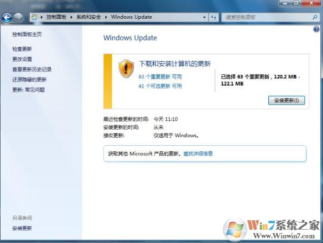 3、在左侧窗格中,单击“检查更新”。如果之前有重要更新会显示先需要安装的重要更新。需要先行安装。