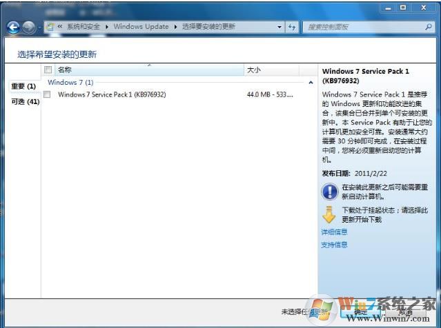 4.如果发现任何重要更新,请单击链接以查看可用更新。 在更新列表中,选择“Microsoft Windows Service Pack (KB976932)”,然后单击“确定”。