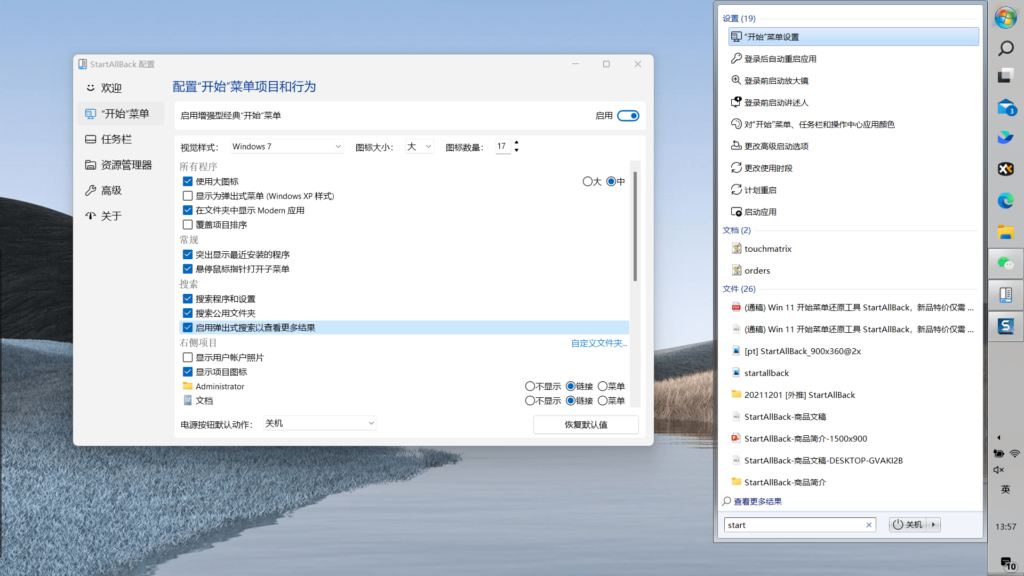 StartAllBack支持在任务栏上为Windows 11恢复经典样式的Windows 7主题风格开始菜单。