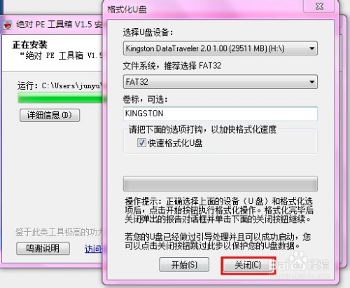 10、安装完成,点击关闭!一个U盘启动盘就完成了。