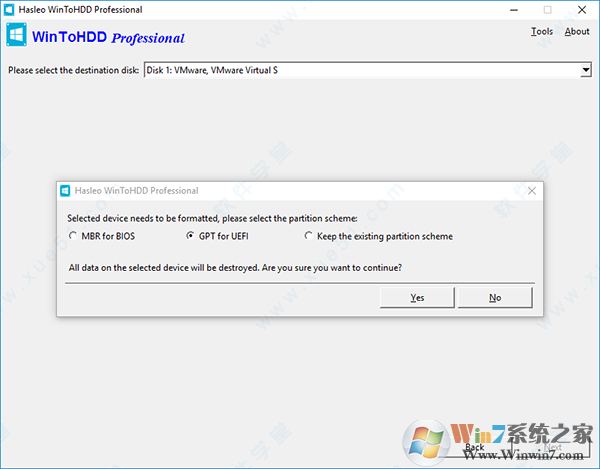 3、在下拉列表中选择目标磁盘,将出现一个弹出窗口,询问您是否要继续格式化,选择要使用的分区方案,然后单击“是”对其进行格式化。如果选择“保留现有分区方案”,则需要在此步骤之前手动准备磁盘上的分区,这是有关如何为目标磁盘手动准备分区的用户指南;