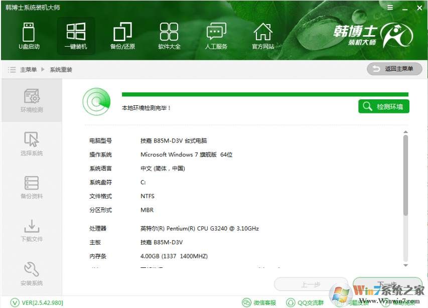 2:进入软件“系统重装”,工具自动为电脑进行检测。完成后点击“下一步”后,