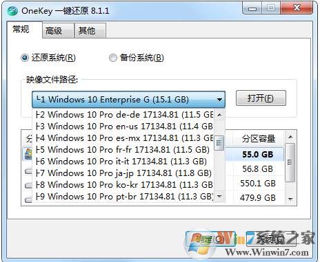 1、打开Onekey然后点击打开,选择ISO镜像(原版或GHOST系统都可以),如下图,小编选择的是windows10多系统镜像合集,工具精确的识别了所有系统;