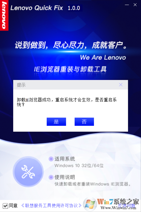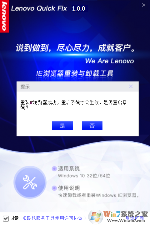 4、点击“是”重启电脑完成设置。重装之前先确定你的IE搜藏夹等都已经备份,重装后会消失。