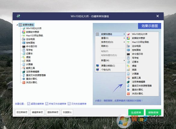 5、右键菜单快捷组功能:只需要在桌面上单击右键,就可以打开常用程序、进行关机重启操作了!