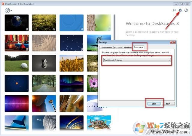 1、如图启动DeskScapes8桌面后 点击设置图标——Language