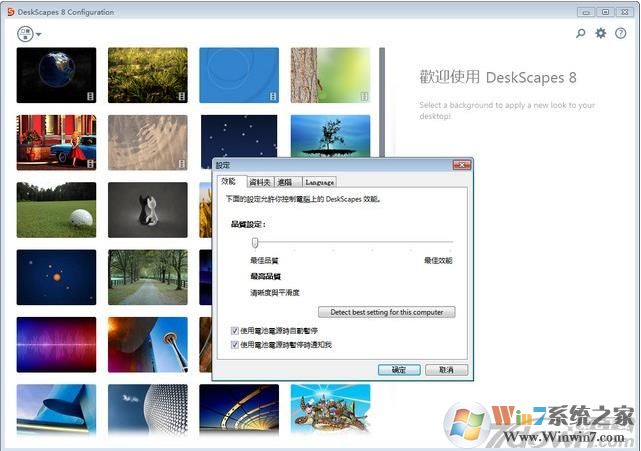 DeskScapes软件设置上可以对桌面增加各种特效,可以自定义显示质量、速度、笔记本试用电池时禁用以省电等~ 而且,动态效果只会在显示桌面时才会启动,当你启动全屏应用或者游戏时,软件会自动禁用让你的电脑获得最佳的性能以及更小的资源消耗!