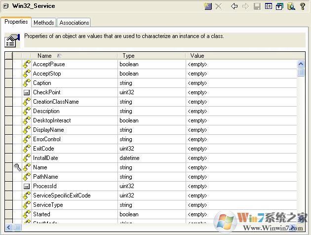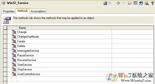可以看到wmi的结构组织图就像注册表一样,是个树型结构,各个节点下面都有相应的属性节点和方法。点击上图的搜索按键,输入win32_Service后,就可以查询到wmi中关于服务的相关属性和方法了