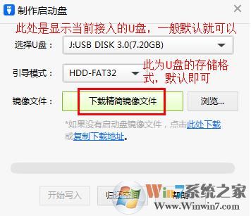 第三步:点击“下载精简镜像文件”。(注:如果电脑接入了多个U盘,请注意选择用来制作启动盘的U盘!!!)